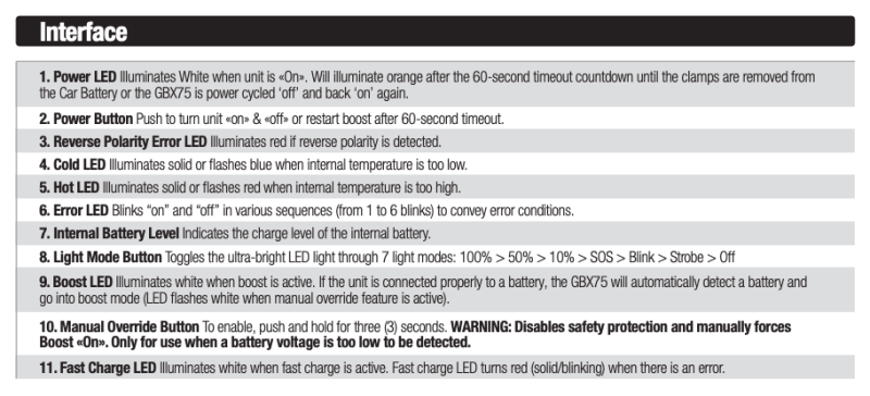 Above is an extract from the NOCO Boost X GBX75 User manual to highlight what a portable jump starter looks like and where the controls are located.
